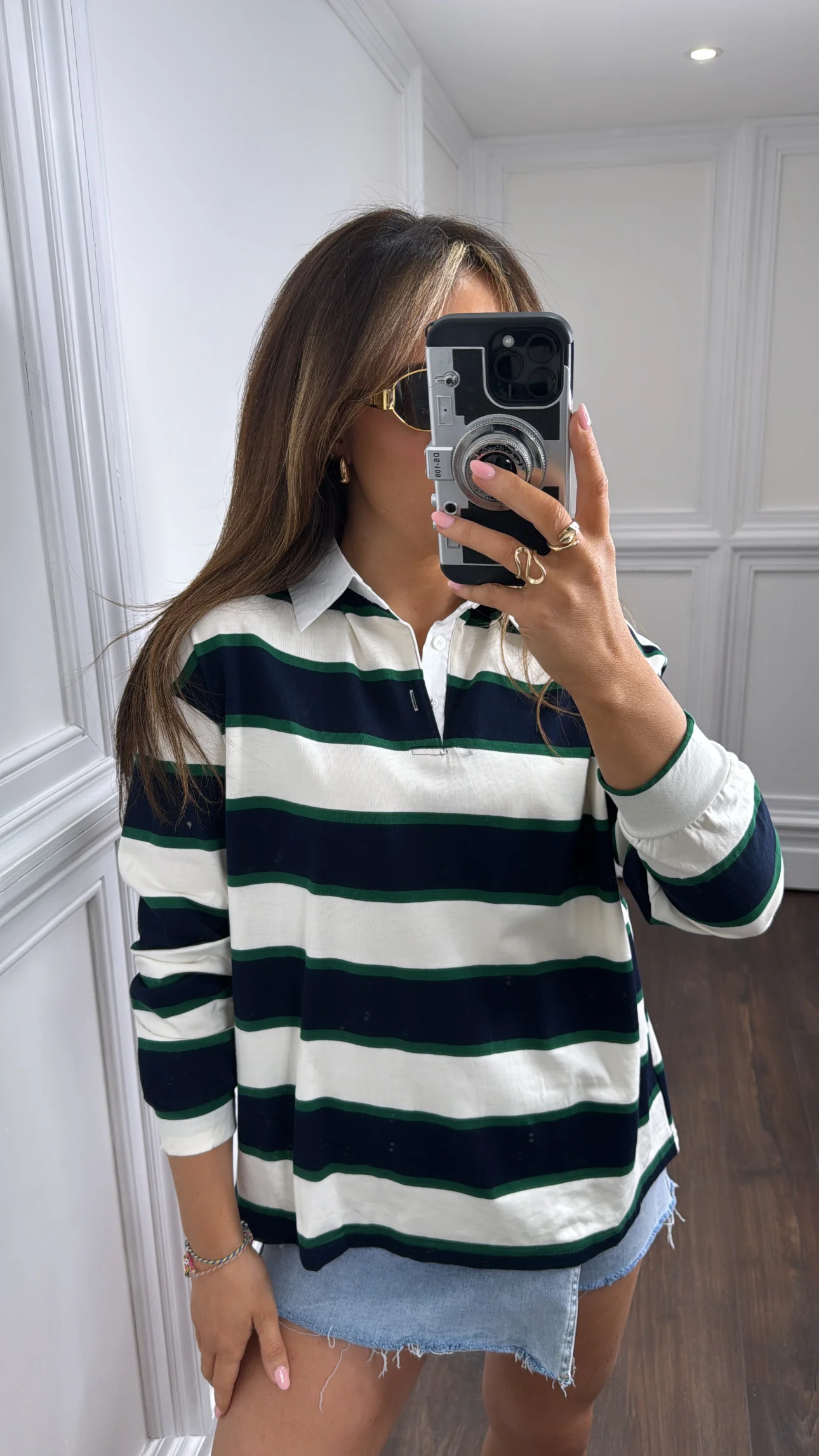 Introducing our ALISSA long sleeve top with navy, green, and cream stripes, accented by a stylish collar detail. Perfect for adding a touch of fashion to any outfit. Stay comfortable and stylish all day long.