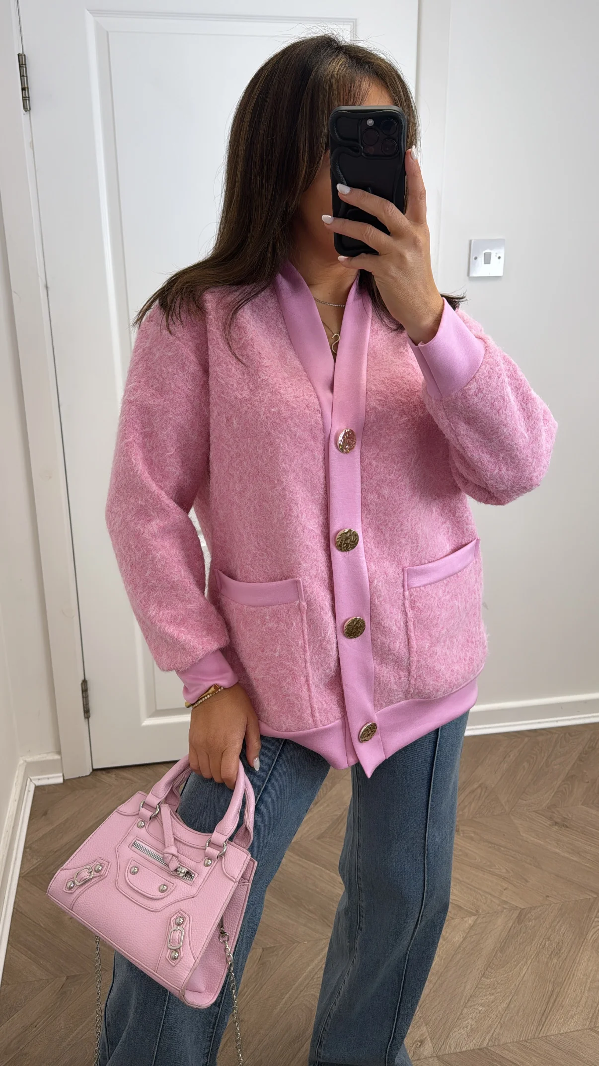 Wrap yourself in effortless elegance with this luxuriously soft pink cardigan. Crafted from sumptuous fabric that feels like a gentle embrace, it features gleaming gold button details that elevate your everyday style. Whether layered over a slip dress or worn solo, this piece embodies off-duty chic—the kind of relaxed sophistication that makes getting dressed feel like second nature. A wardrobe essential for those who refuse to compromise on comfort or style.