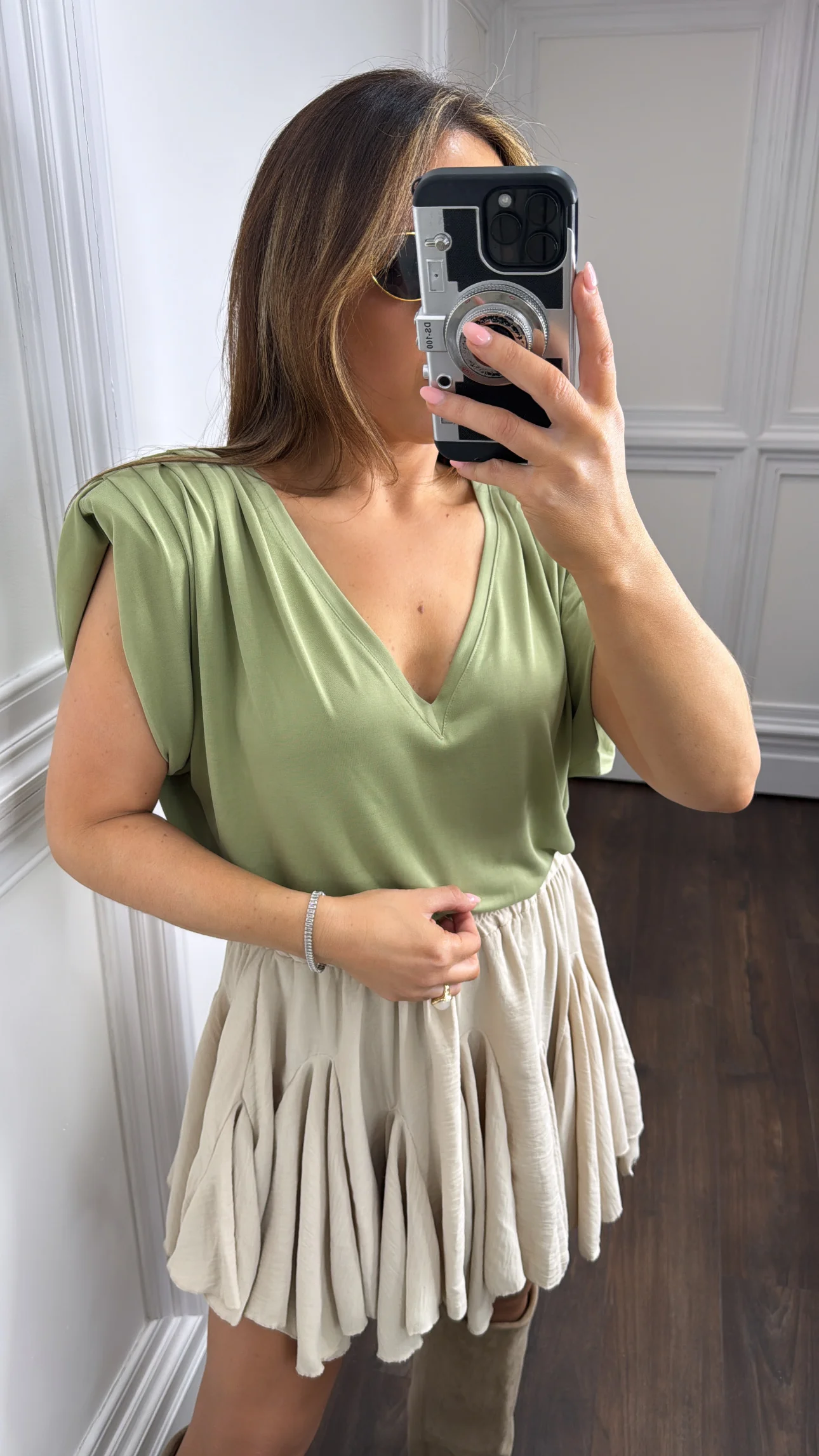 Introducing the CASSIE green shoulder pad t-shirt, perfect for the new season. With trendy shoulder pads and a flattering v-neck, this top adds a touch of fashion to any outfit. Complete the look with short sleeves for a chic and stylish ensemble.