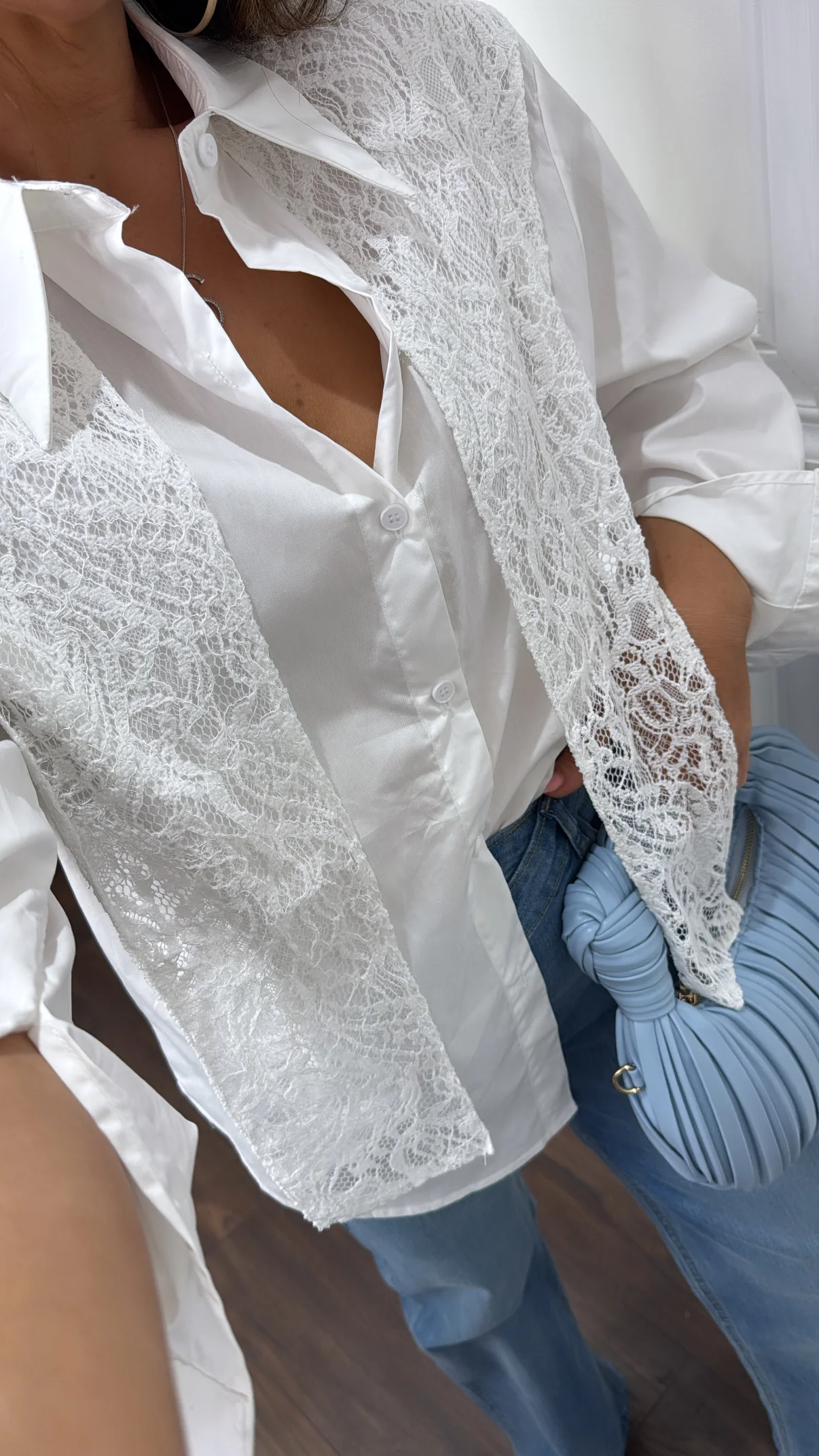 Elevate your fashion game with our JADE white shirt. Featuring a delicate lace on the back, this lovely shirt can be dressed up or dressed down with the option to tie the lace overlay or leave it down. Perfect for a chic and versatile look with denim shorts or a dressier ensemble.