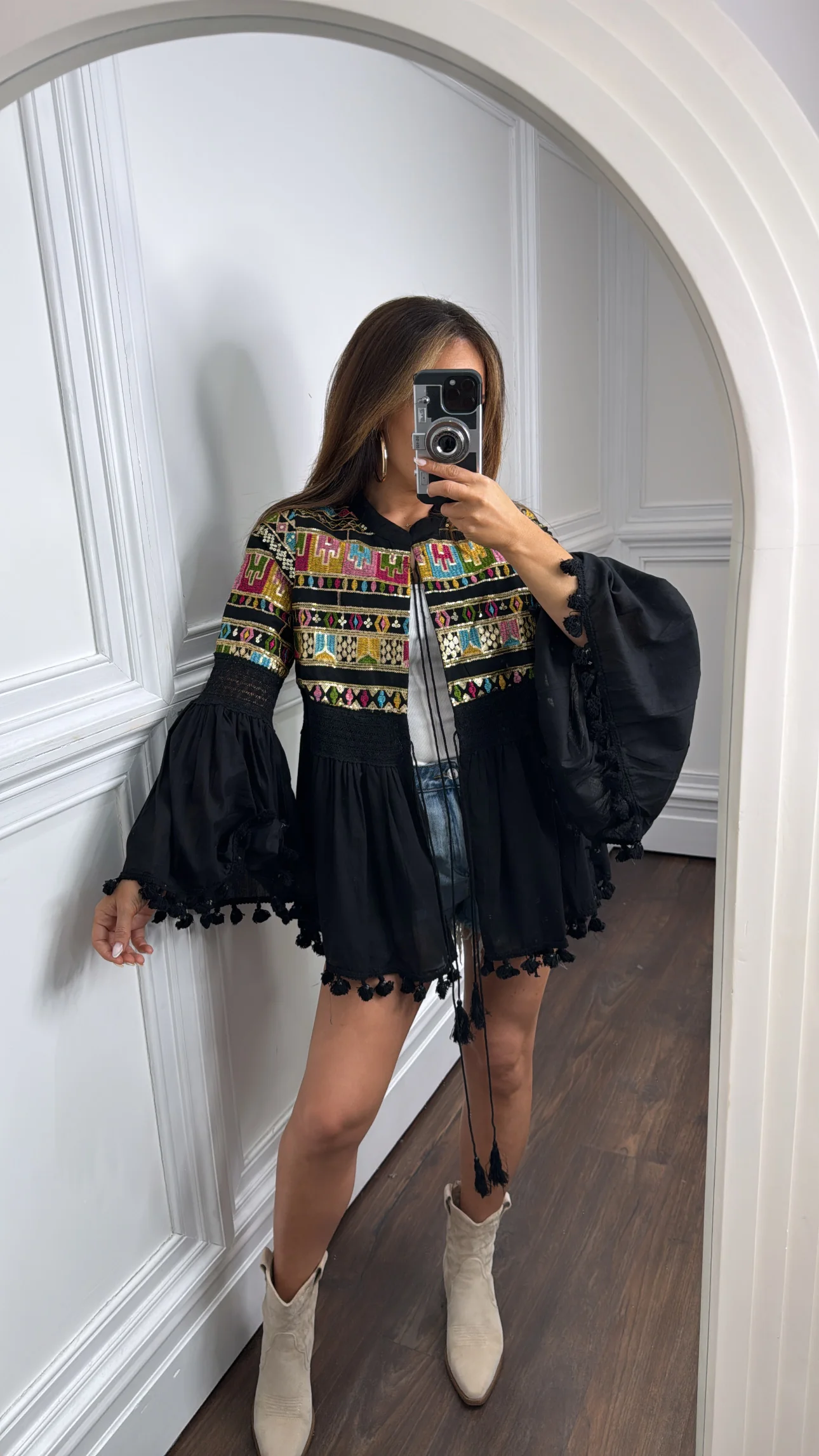 Our boho-chic MEGAN top exudes effortless vacation vibes with its versatile white base and vibrant embroidered details. Adorned with eye-catching sequins and colourful embroidery, the statement piece features playful tassel edges and a tassel tie-up closure. Style it as a lightweight jacket or standalone top for that perfect holiday ensemble that transitions seamlessly from beach to dinner.