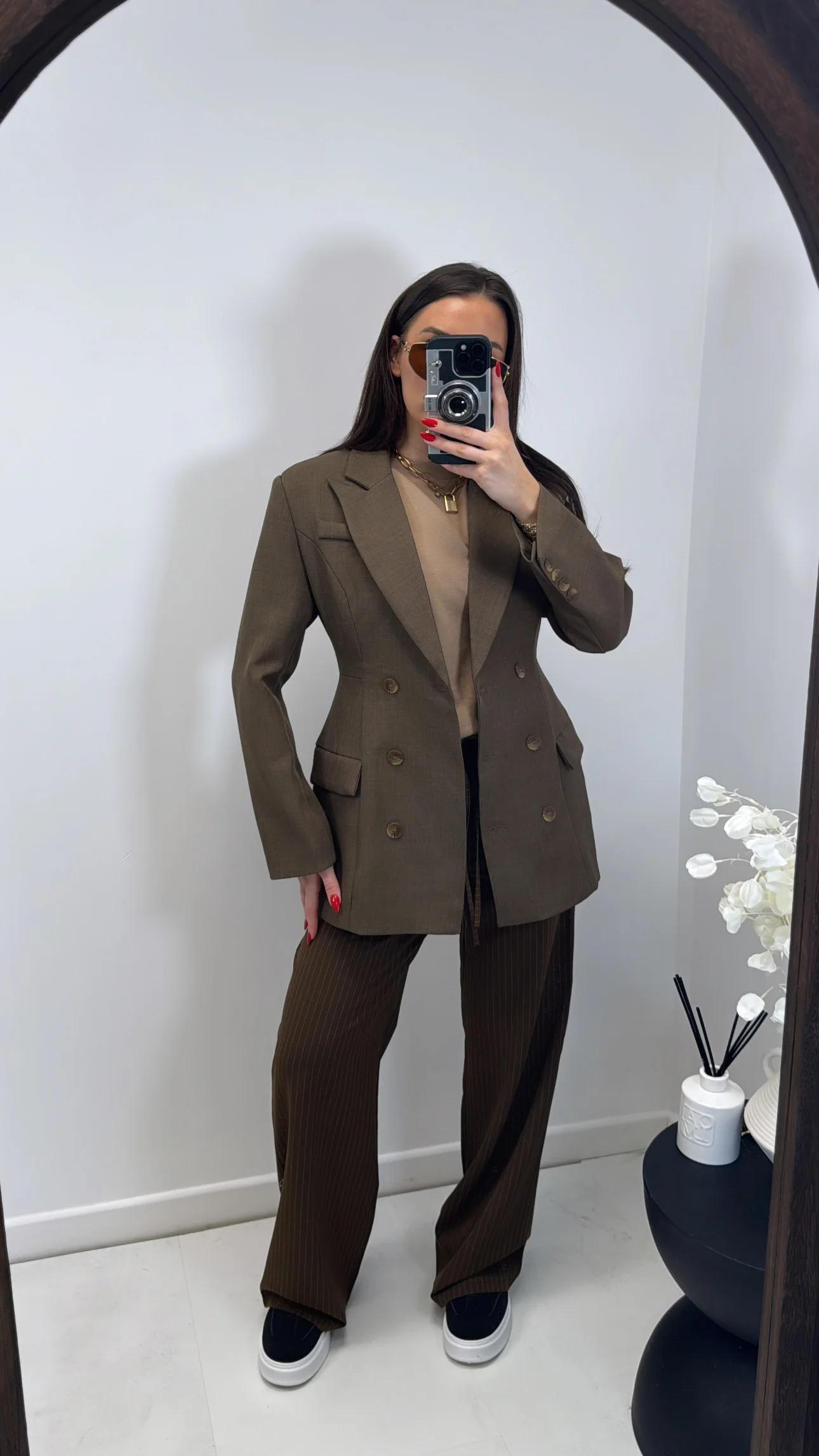Elevate your wardrobe with this sophisticated taupe longline blazer. Crafted with a tailored silhouette that flatters the figure, it features distinctive doubled buttons for a contemporary edge. The extended length offers versatile styling—layer it over dresses for polished elegance or wear solo as a statement piece. Perfect for transforming casual looks into refined ensembles, this blazer brings intelligent design to everyday dressing.