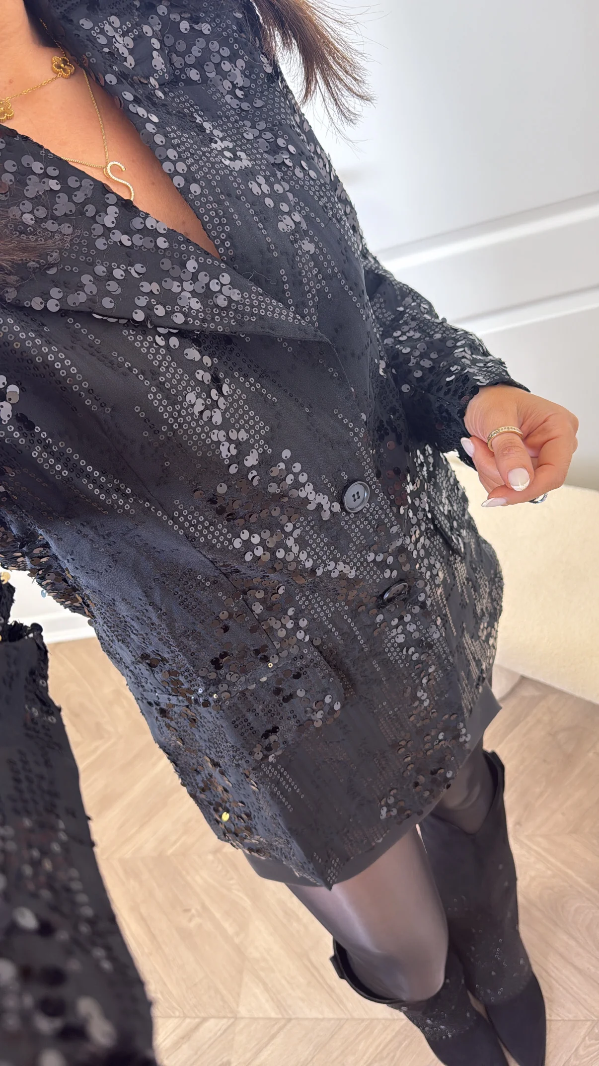 Make a statement this party season with the YARA black sequin jacket. Crafted for those who dare to shine, this luxe piece features all-over sequin detailing that catches the light with every move. Structured shoulder pads deliver a bold, confident silhouette that commands attention. Perfect for elevating evening looks, from cocktail events to celebrations. Pair with tailored trousers or a sleek slip dress for effortless glamour.